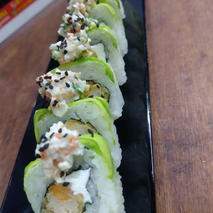 camaron,queso crema ,pepino por dentro,decorado con aguacate por fuera