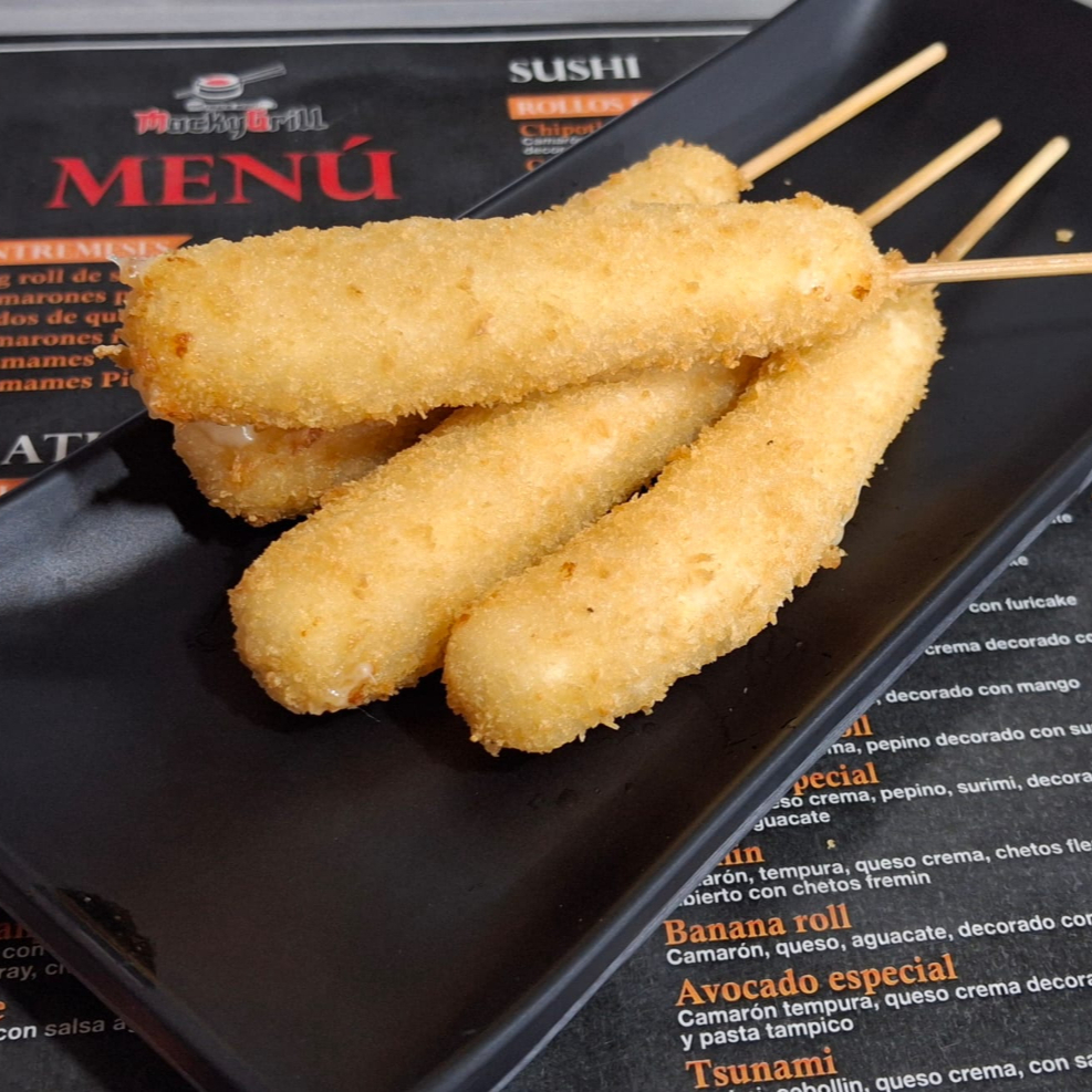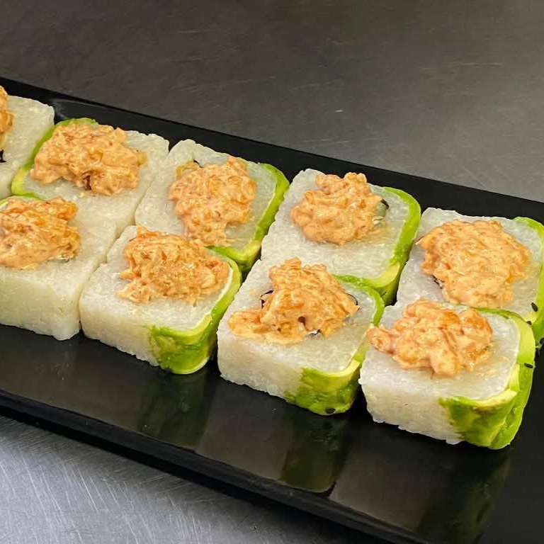 queso crema,aguacate,surimi frito por dentro, decorado con surimi frito bañado en aderezo chipotle
