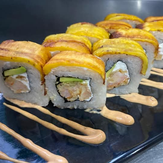 camarón queso crema aguacate, plátano por dentro cubierto con platano macho