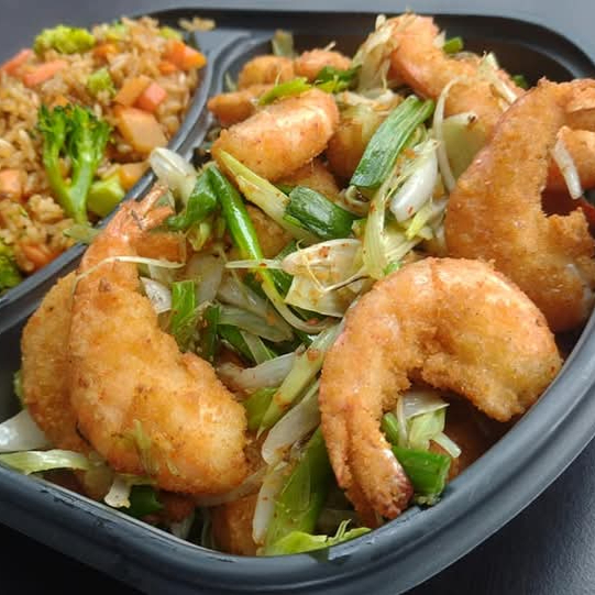 camarones empanisados salteados con cebolla cambrayy chile de arbol