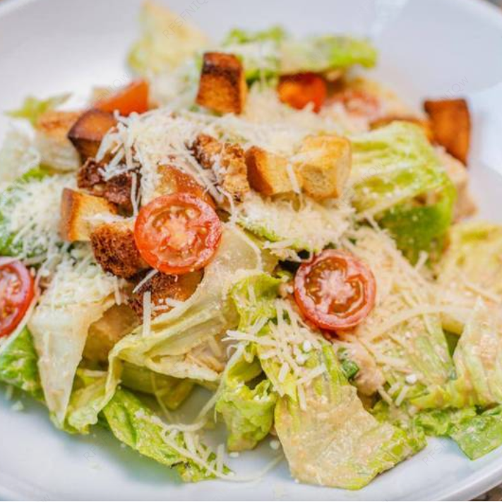 Lechuga romana, croutones de parmesano y aderezo césar.
