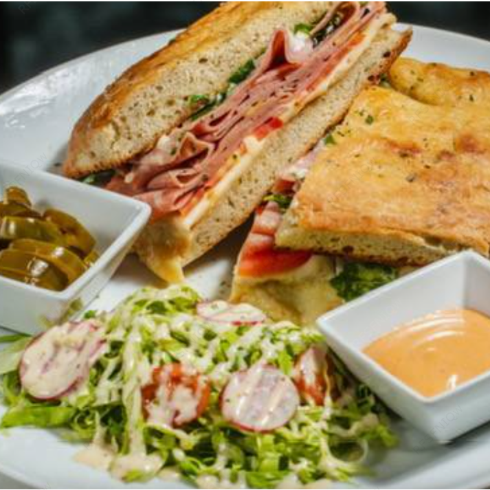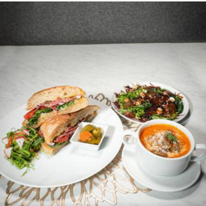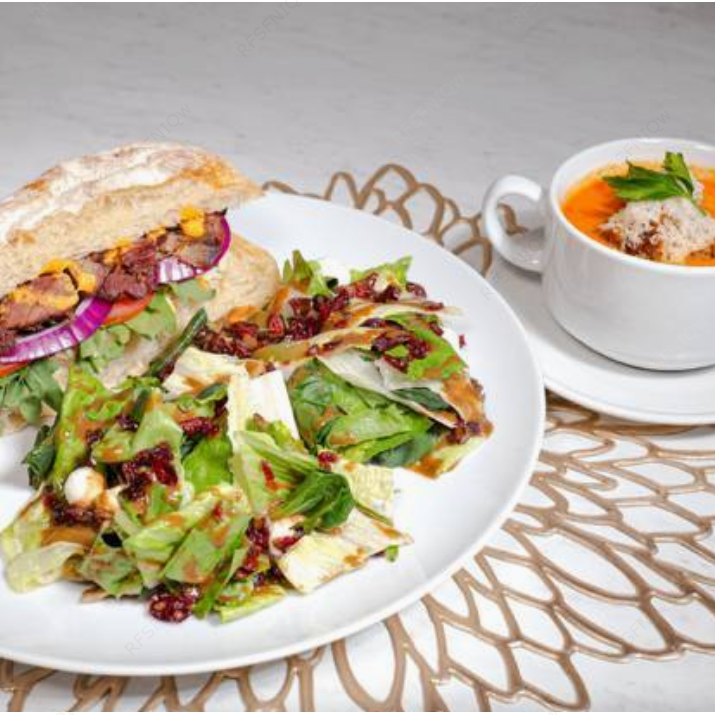 Medio panini del chef, sopa de tomate, ensalada monique pequeña.