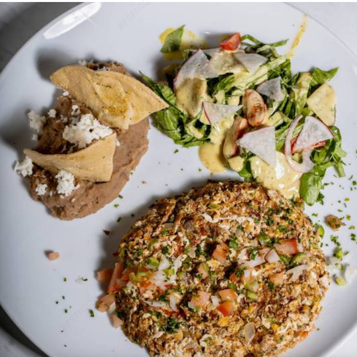 Machacado, huevo, frijoles, tortillas de maíz, salsa.