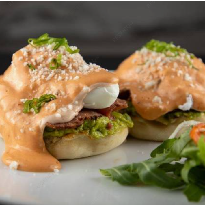 Servidos en english muffin, 2 huevos pochados con roast beef, salsa especial de chipotle y aguacate.