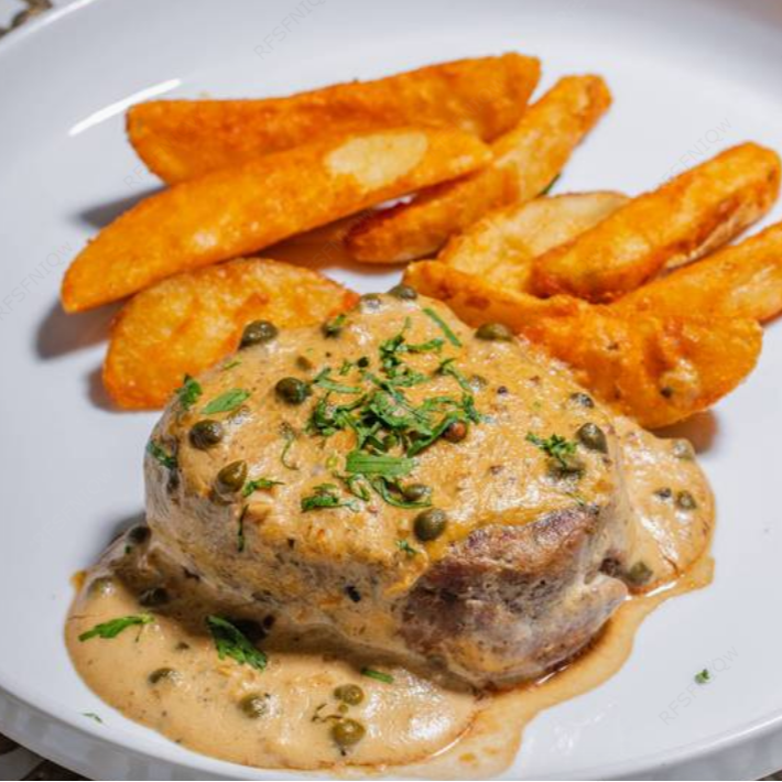 Con demi glace, crema, alcaparras y papas a la francesa.