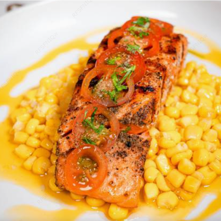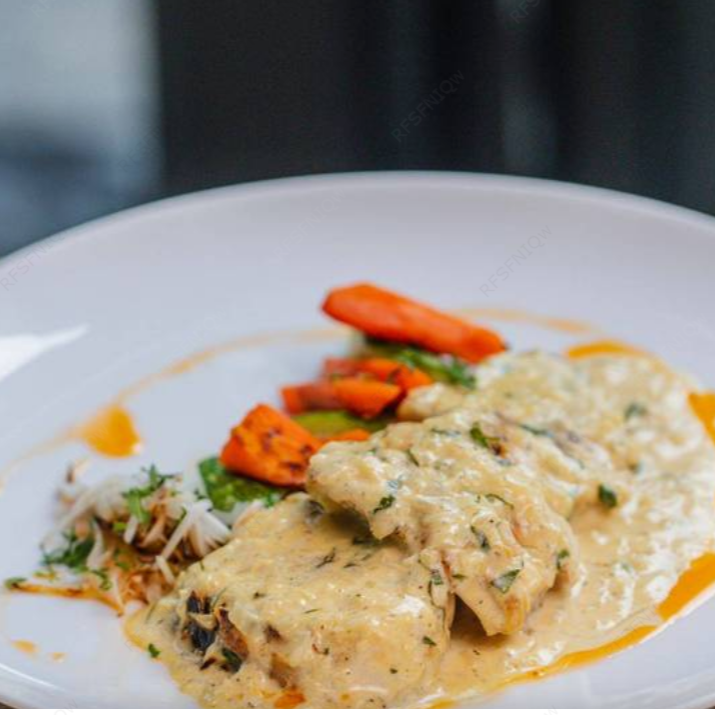 Pechuga de pollo. Salsa de mostaza, verduras y cebolla caramelizada.