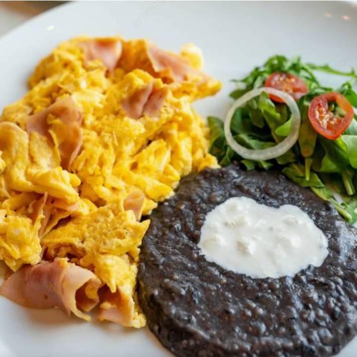 Huevo, jamón, frijoles, tortillas de maíz, salsa.