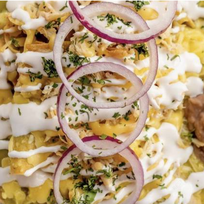 Totopos, salsa verde, queso y crema. Frijoles refritos.