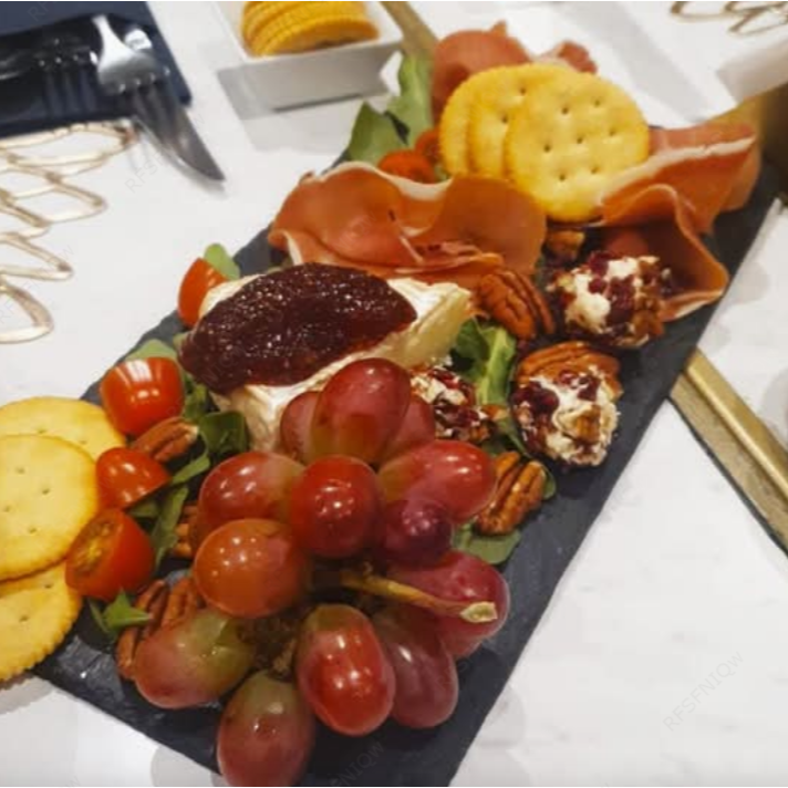 Jamón serrano. Nuez caramelizada. Queso brie con mermelada de higo. Bolitas de queso crema con arándano. Uvas y tomatitos.