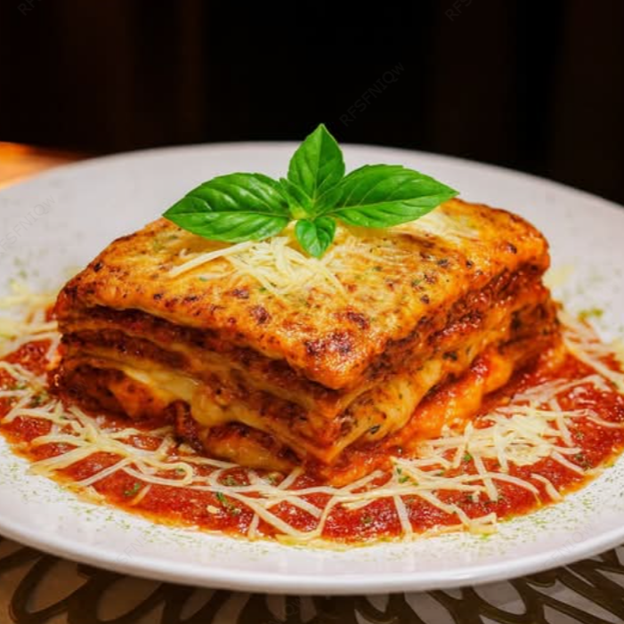 Con salsa de carne de res. Gratinada con queso mozzarella y parmesano.