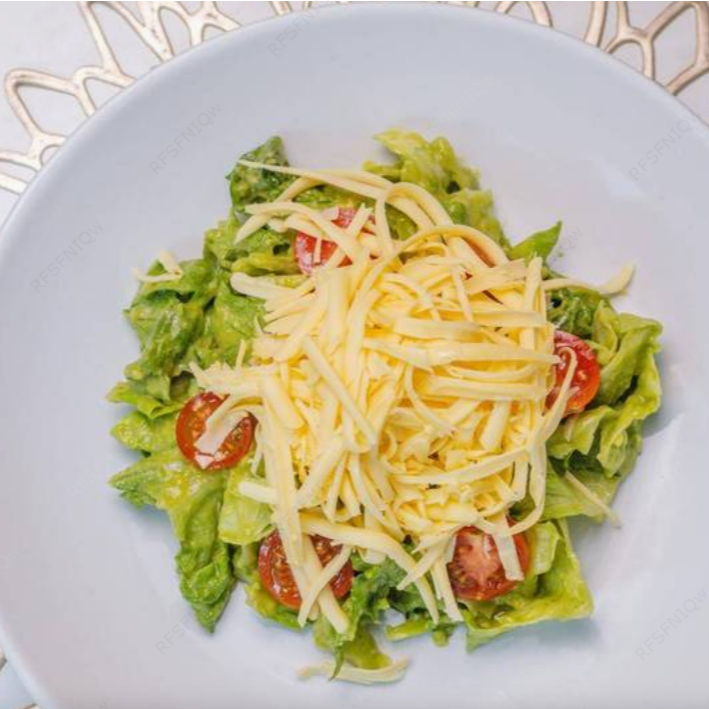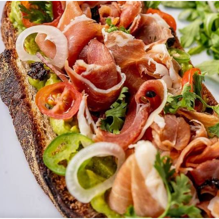 Con tomate cherry, aceitunas, queso manchego y aderezo de aguacate.