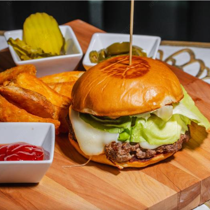 Hamburguesa de sirloin con jamón, queso cheddar y papas gajo.