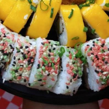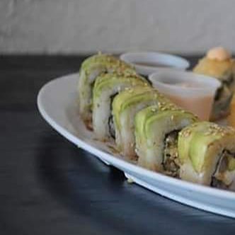 Sushi camarón empanizado, aguacate, Philadelphia gratinado con queso, tocino, su soya y chipotle.