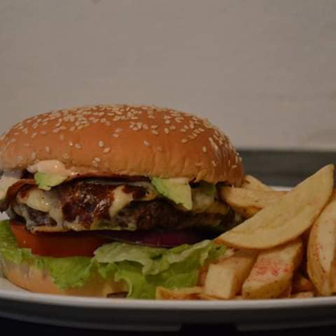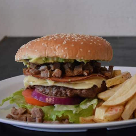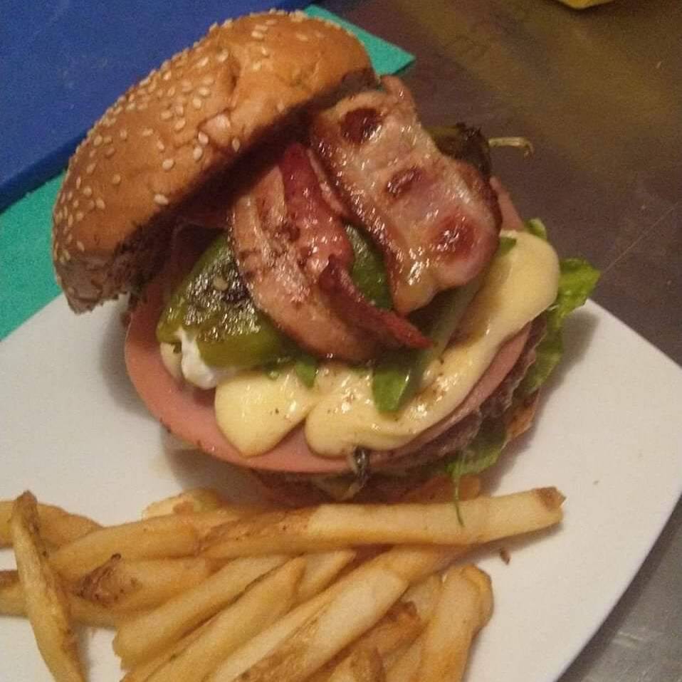 Carne de res, queso, jamón, tocino,verduras ,aderezos,papas fritas .