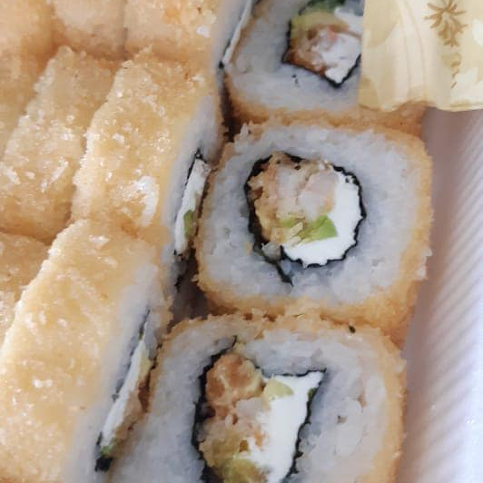 Sushi camarón empanizado , aguacate,Filadelfia gratinado con queso,tocino,su soya y chipotle