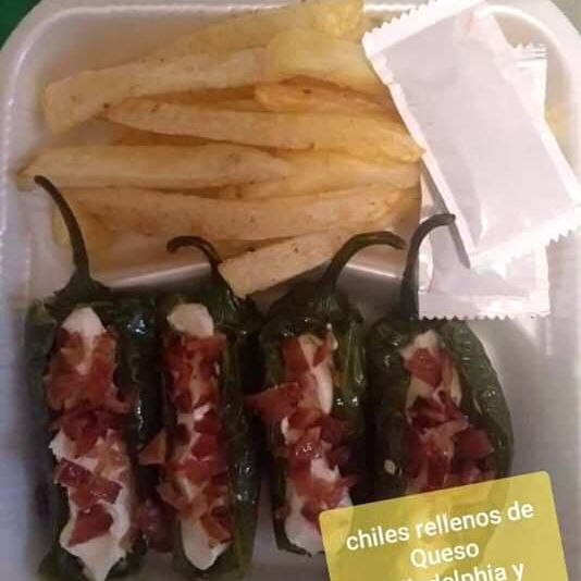 5 Chiles rellenos de philadelphia con delicioso tocino y papas fritas.