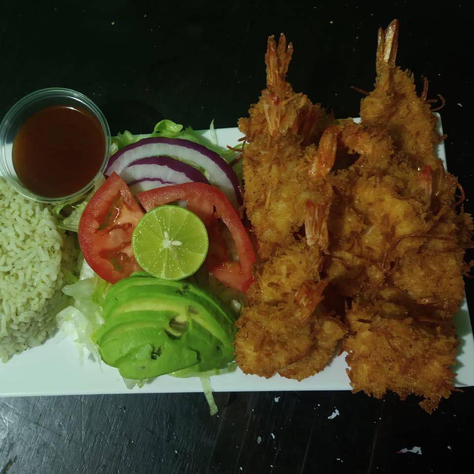10 CAMARONES EMPANIZADOS,ENSALADA,ARROZ FRITO,PAPAS,ADEREZOS Y SALSAS