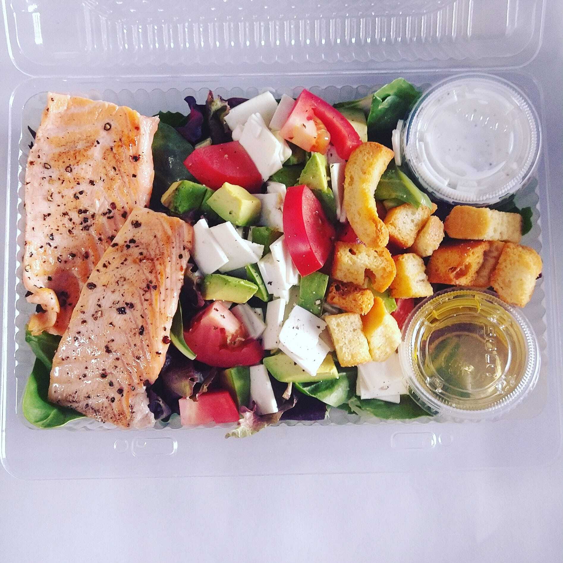 250 Gr de salmón ,tomate, aguacate,crotones,,zanahoria,,limón,lechuga.