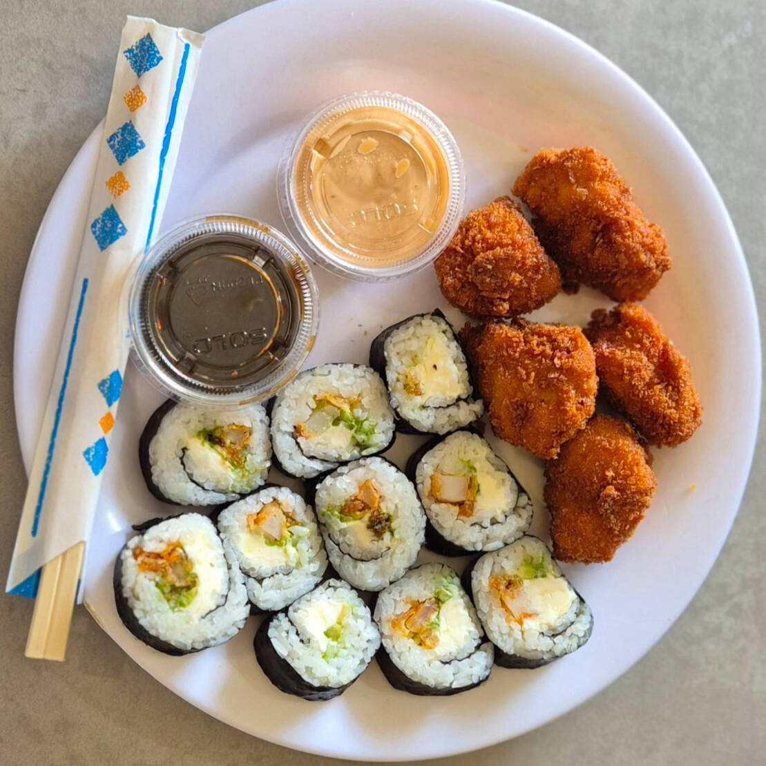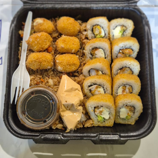 Sushi de camarón ,6 cubos de dedos de queso,arroz frito,Pepsi,400ml,soya y chipotle.