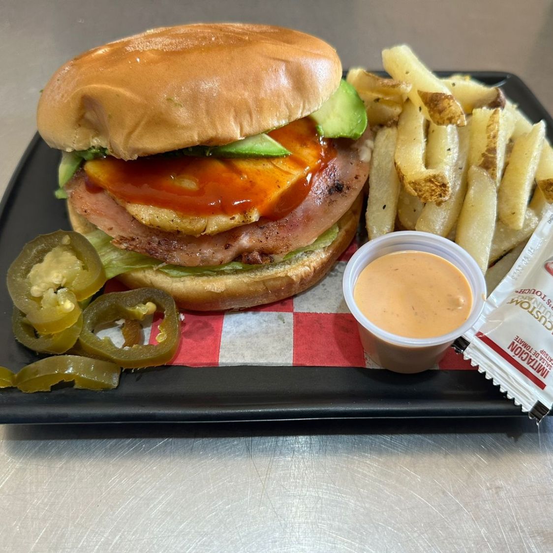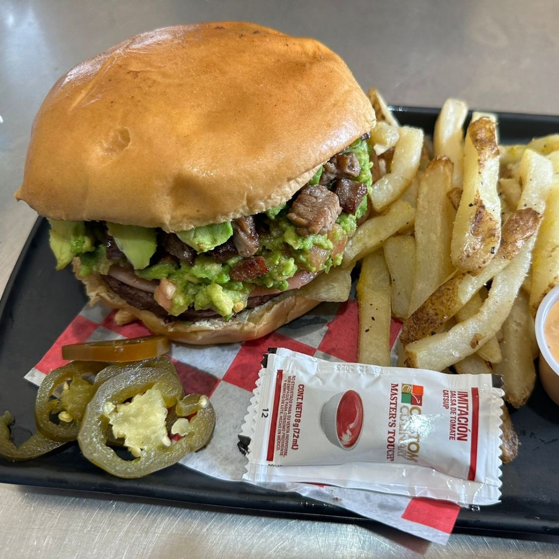 carne de arrcahera, tocino, aros de cebolla, mix de verduras, aderezo chipolte y acompañado de papas a la francesa