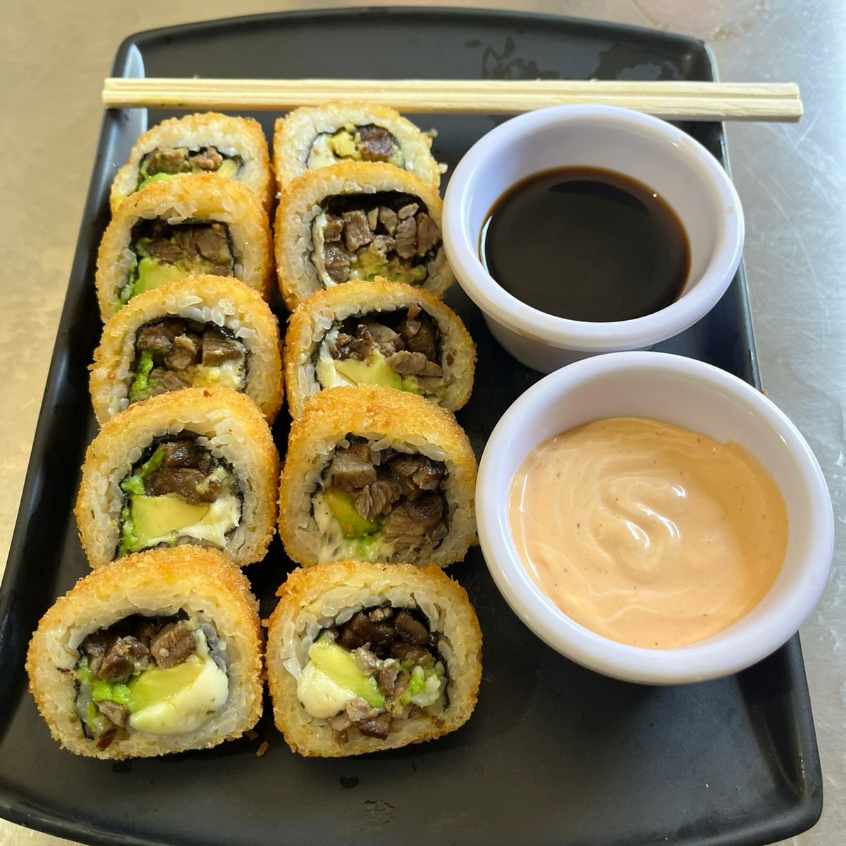 arrachera, queso gouda, aguacate, va empanizado, salsa de soya con chiles toreados y aderezo chipotle.