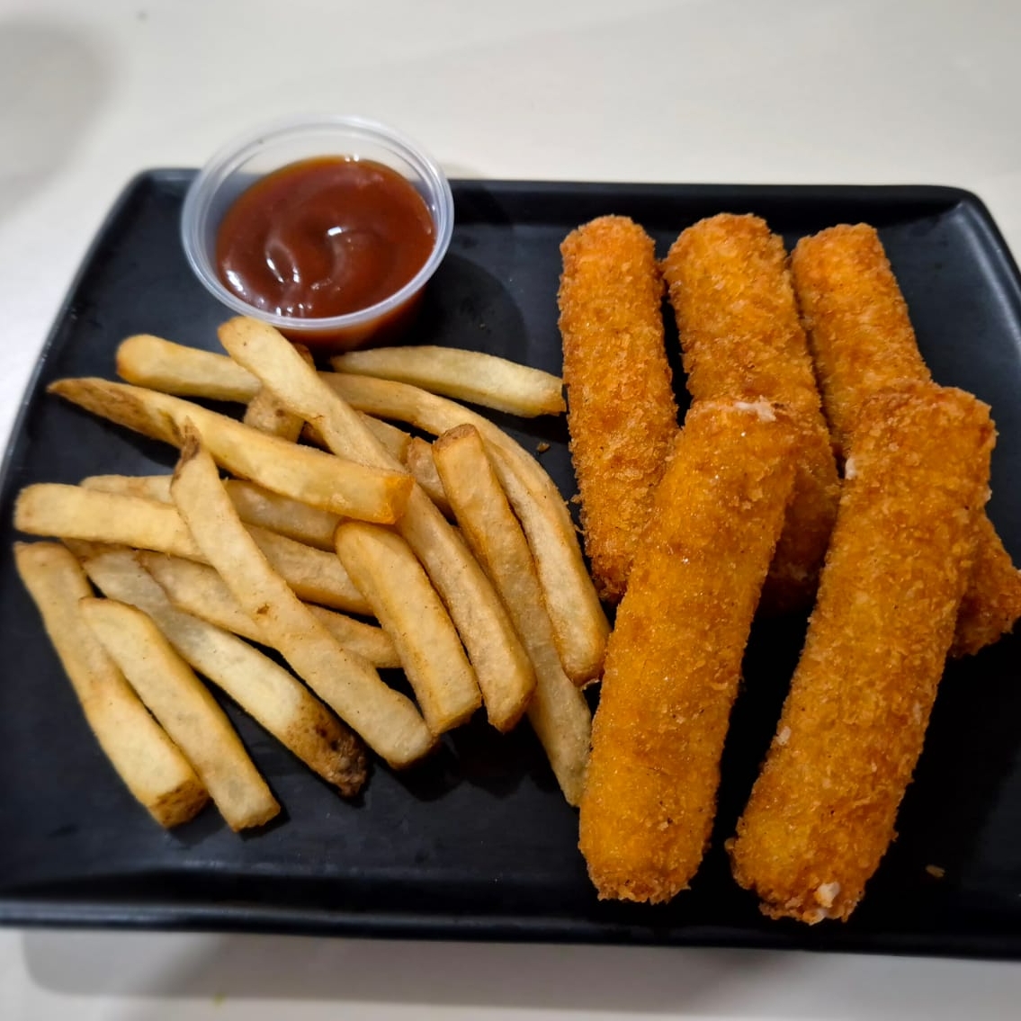 5pz de dedos de queso mozarella, salsa bbq, y papas a la francesa