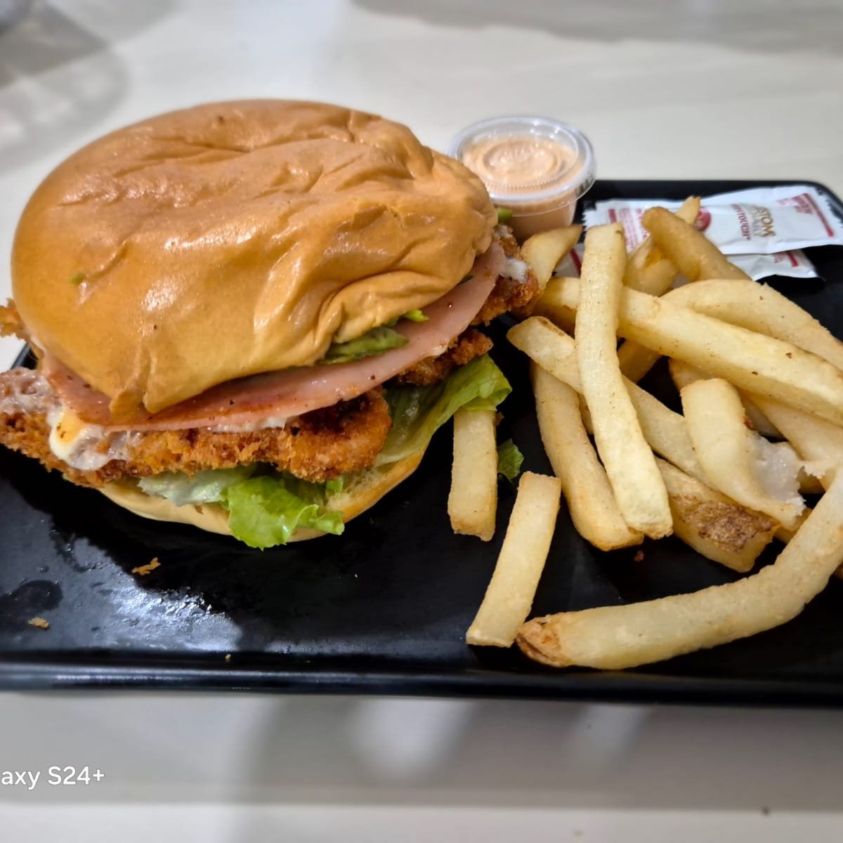milanesa de pollo empanizada, mix de verduras, queso, jamon, papas a la francesa.