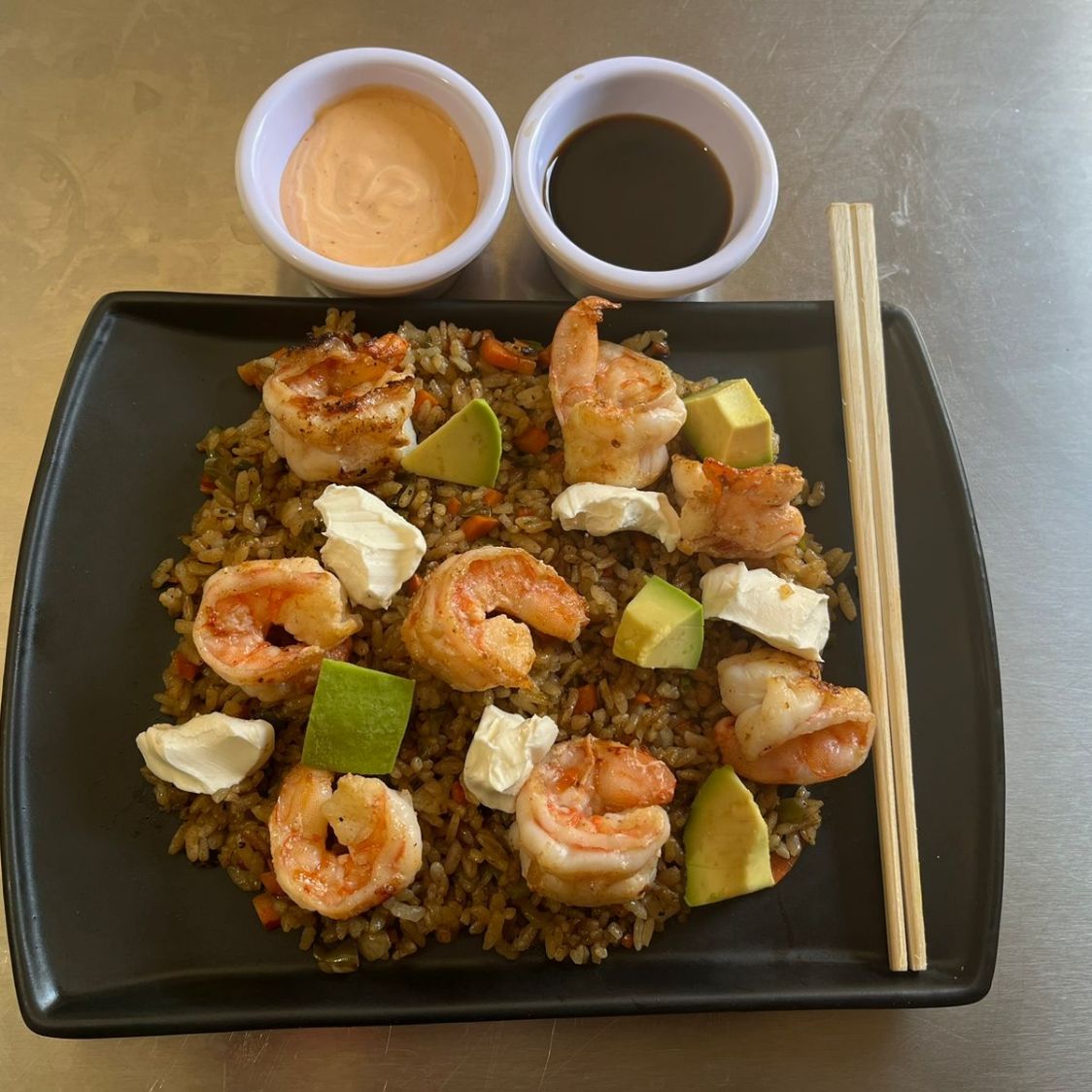 porcion de arroz frito con verduras, res, camaron, pollo, queso philadelphia, aguacate y aderezos.