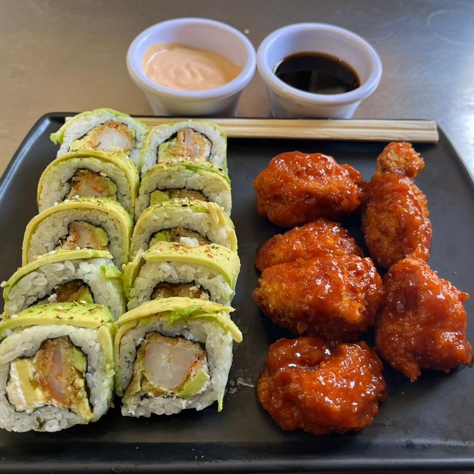 1 sushi a elegir, 5pz de boneles de pollo, aderezos y salsa de soya (poner en comentarios sushi y salsa.