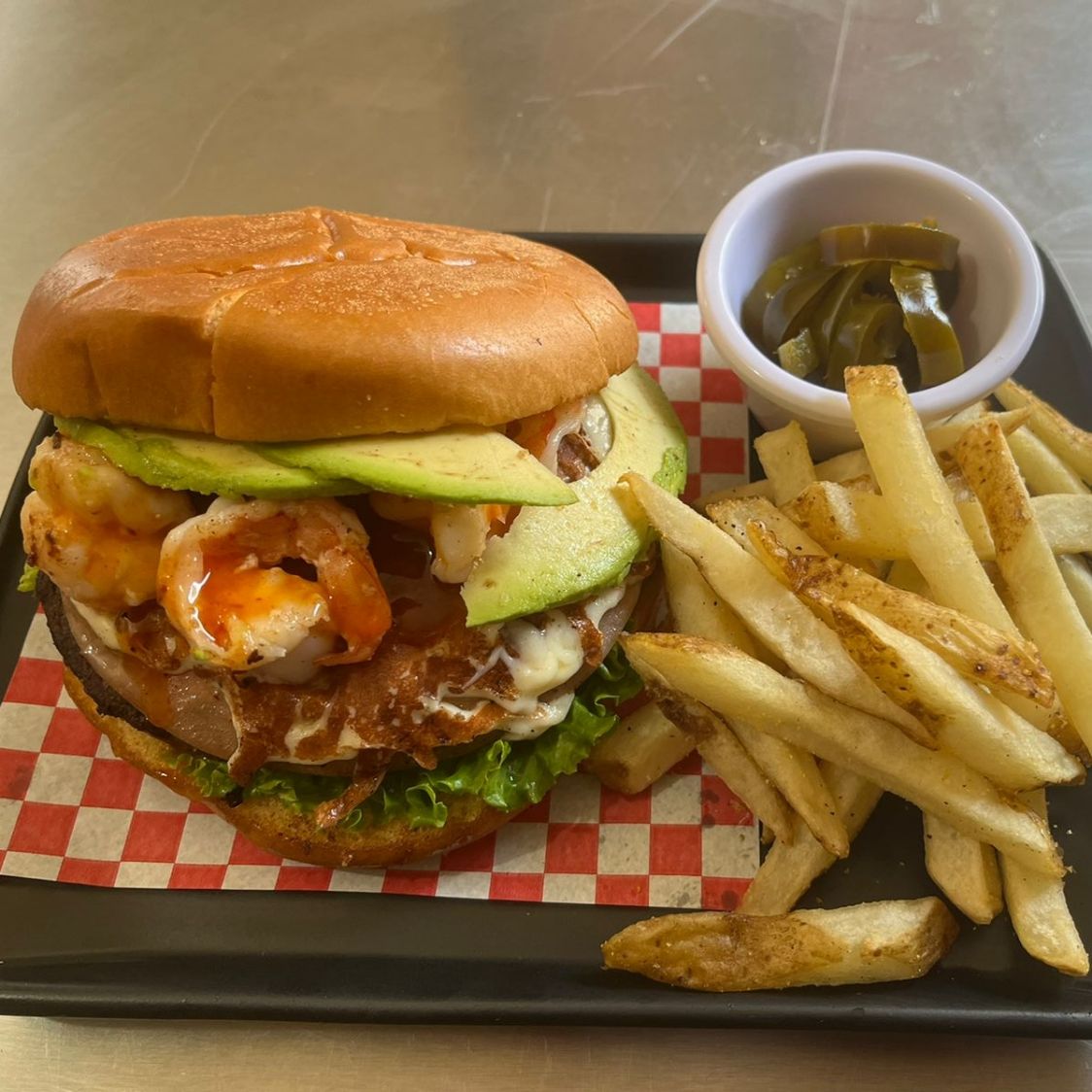 carne de arrachera, camaron salteado, mix de verduras, papas ala francesa y aderezo chipotle