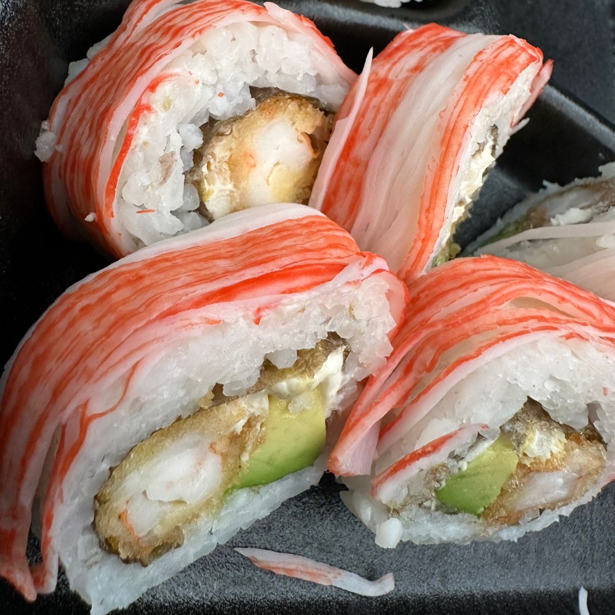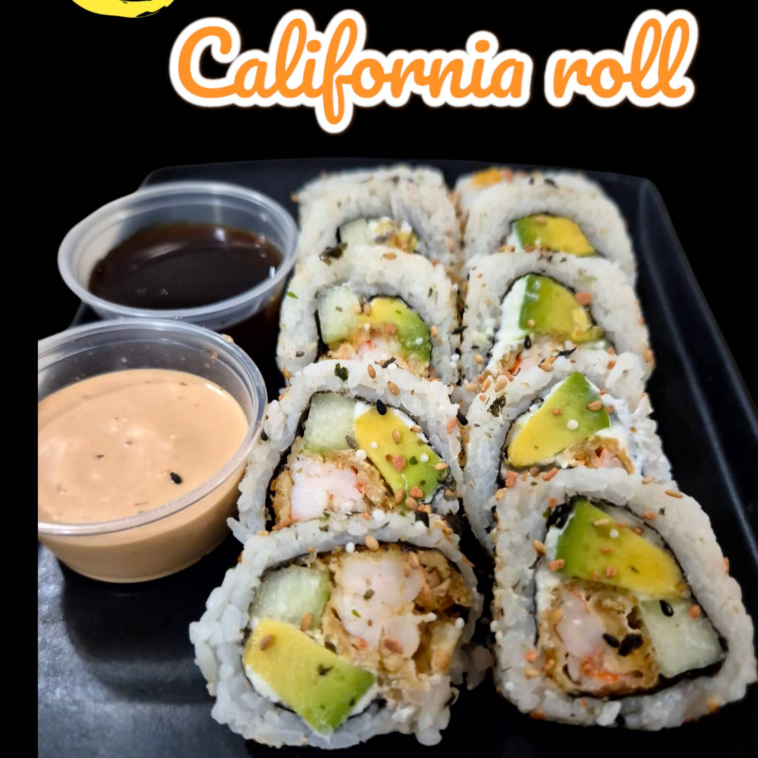 por dentro, camaron cocido, queso crema, aguacate, por fuera tiras de cangrejo acompañado de salsa de soya y salsa de anguila.