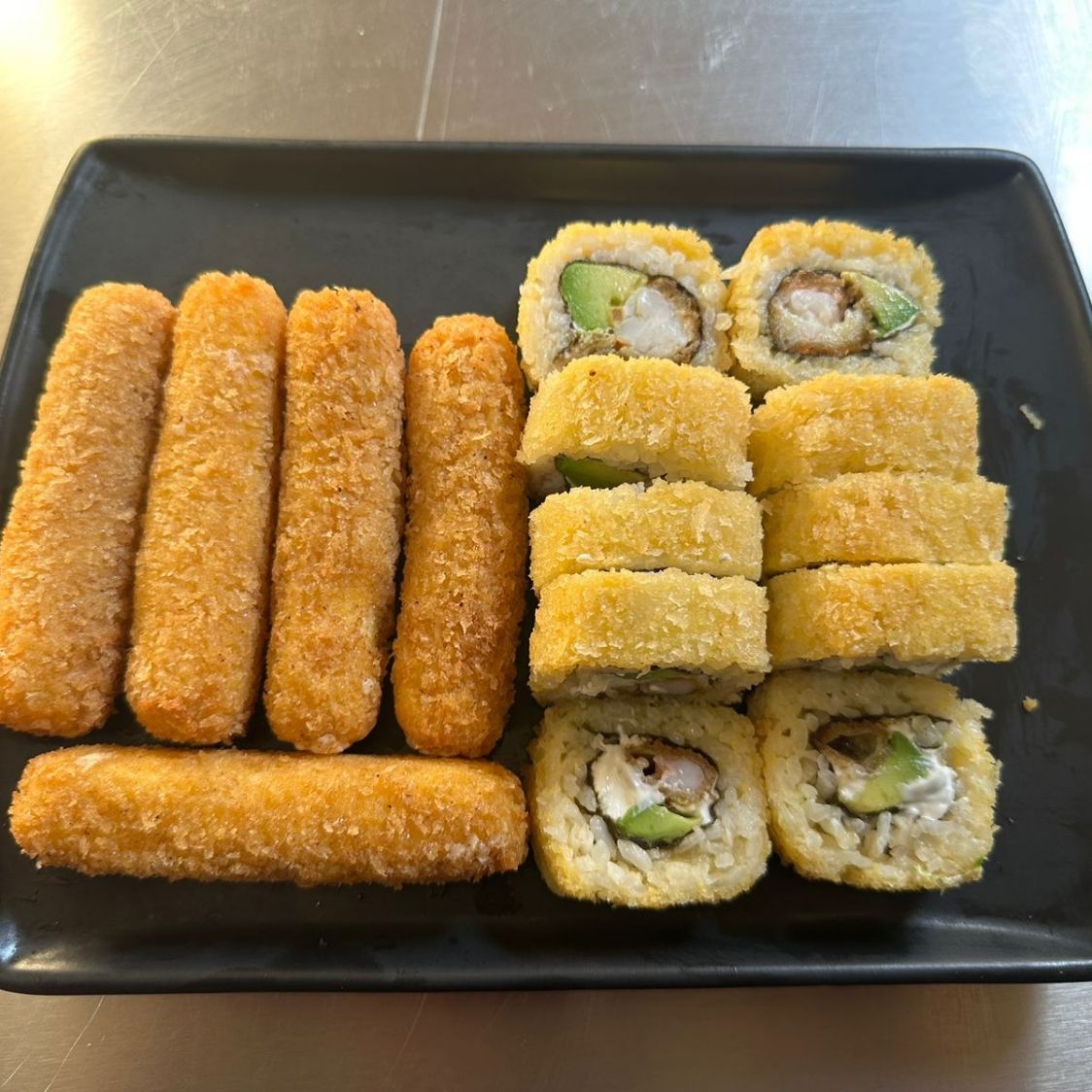 sushi a elegir, 5 pz de dedos de queso, aderezos y salsa de soya (comentar sushi y salsa)