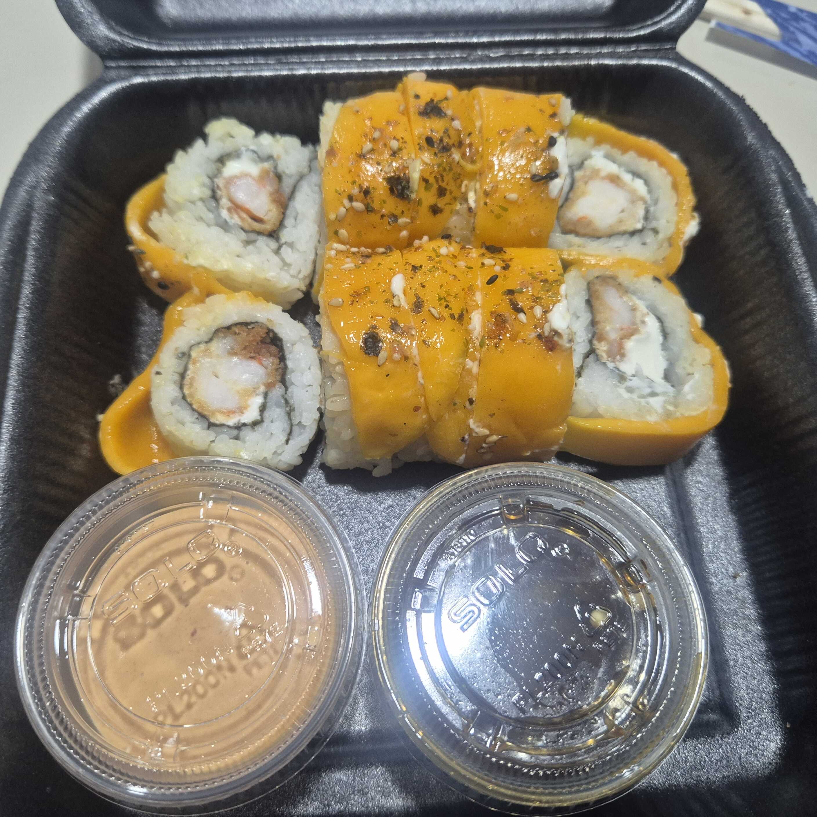 por dentro camaron empanizado, queso crema, por fuera, rebanas de mango