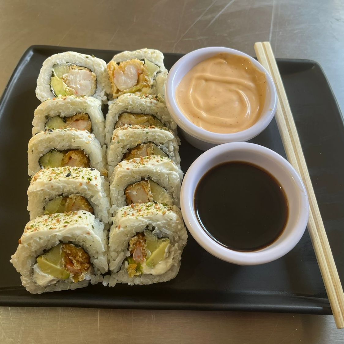 camaron empanizado, queso philadelphia, aguacate, va frio, laminas de aguacate por fuera, aderezo chipotle y salsa de soya con chiles toreados.