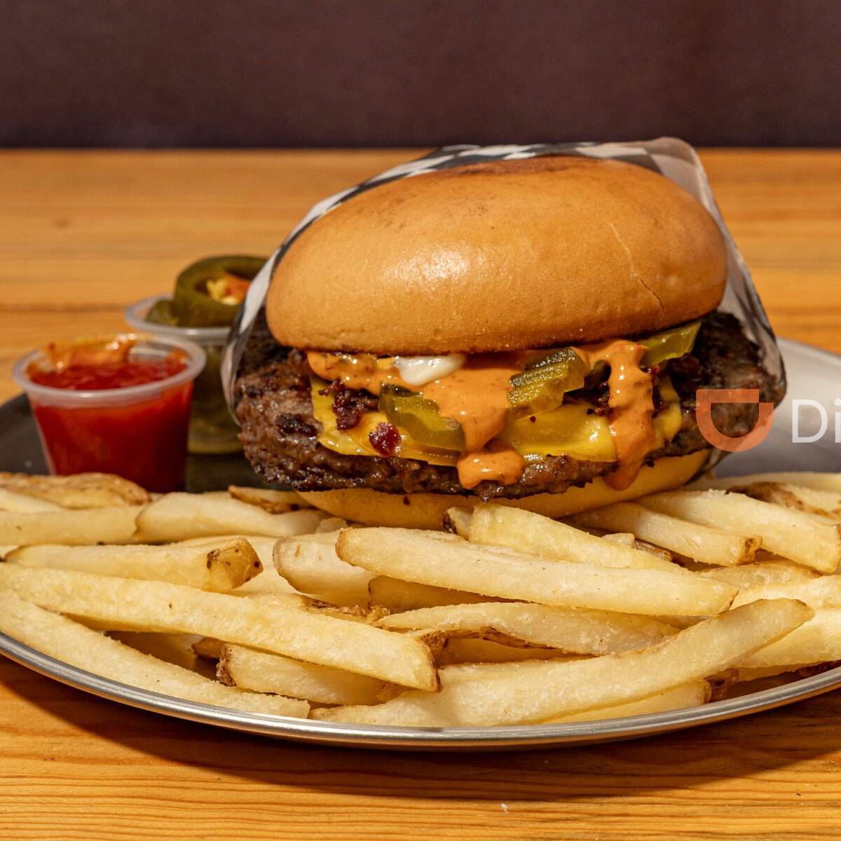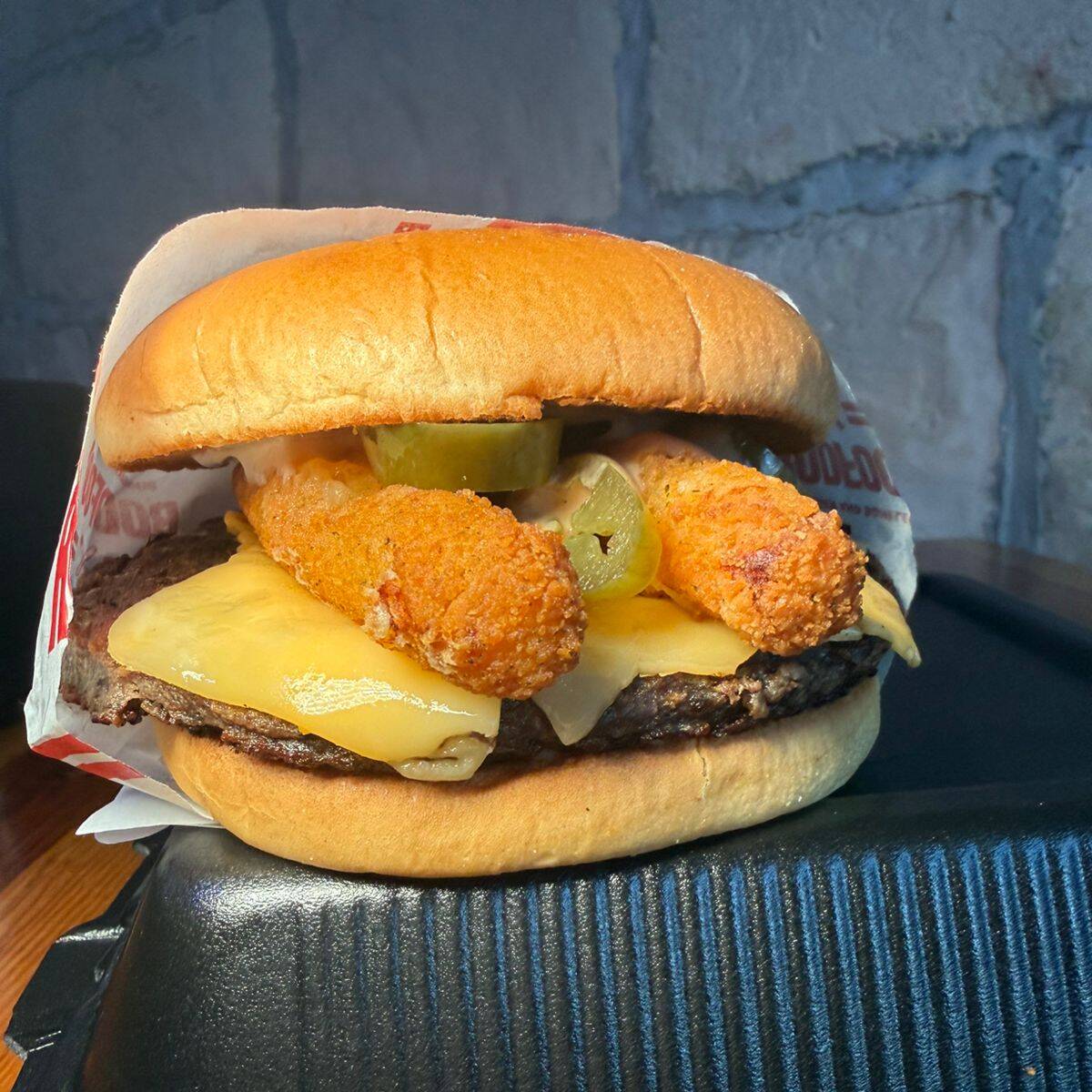 Carne de de sirloin 150 g queso americano, queso chihuahua, 3 dedos de queso, jalapeños, aderezo chipotle y pan brioche.