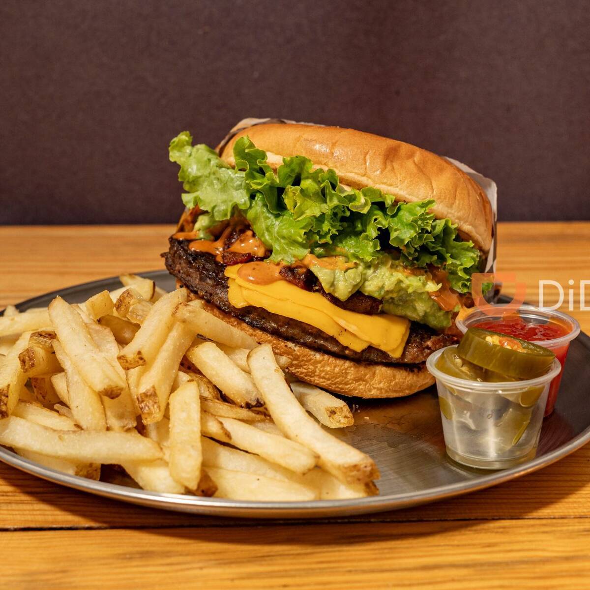 Carne de sirloin 150 g con queso americano, tocino, lechuga italiana, tomate y guacamole en pan brioche horneado.