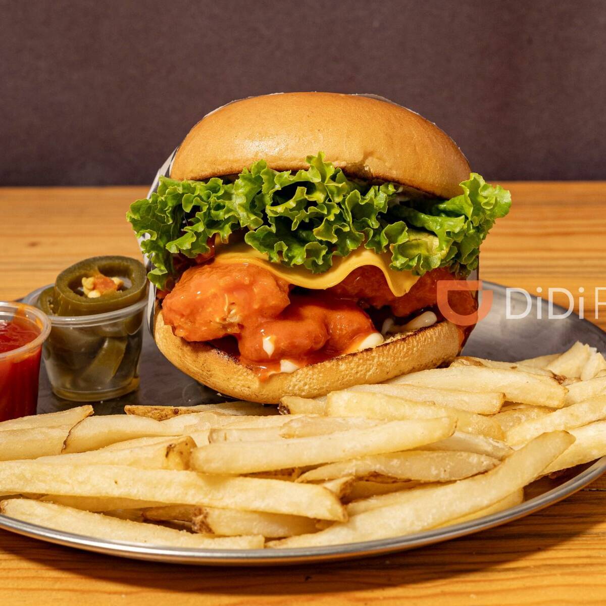 pan brioche con mantequilla, boneless en bufalo, queso, lechuga y mayonesa casera