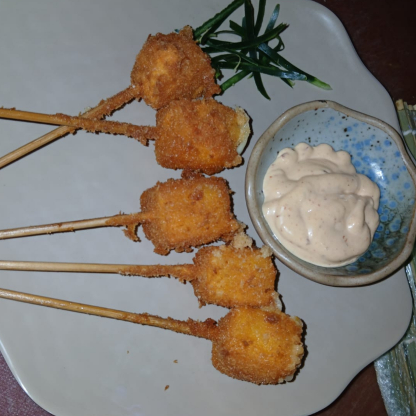 5 dedos de queso manchego empanizados, acompañados del aderezo de la casa.