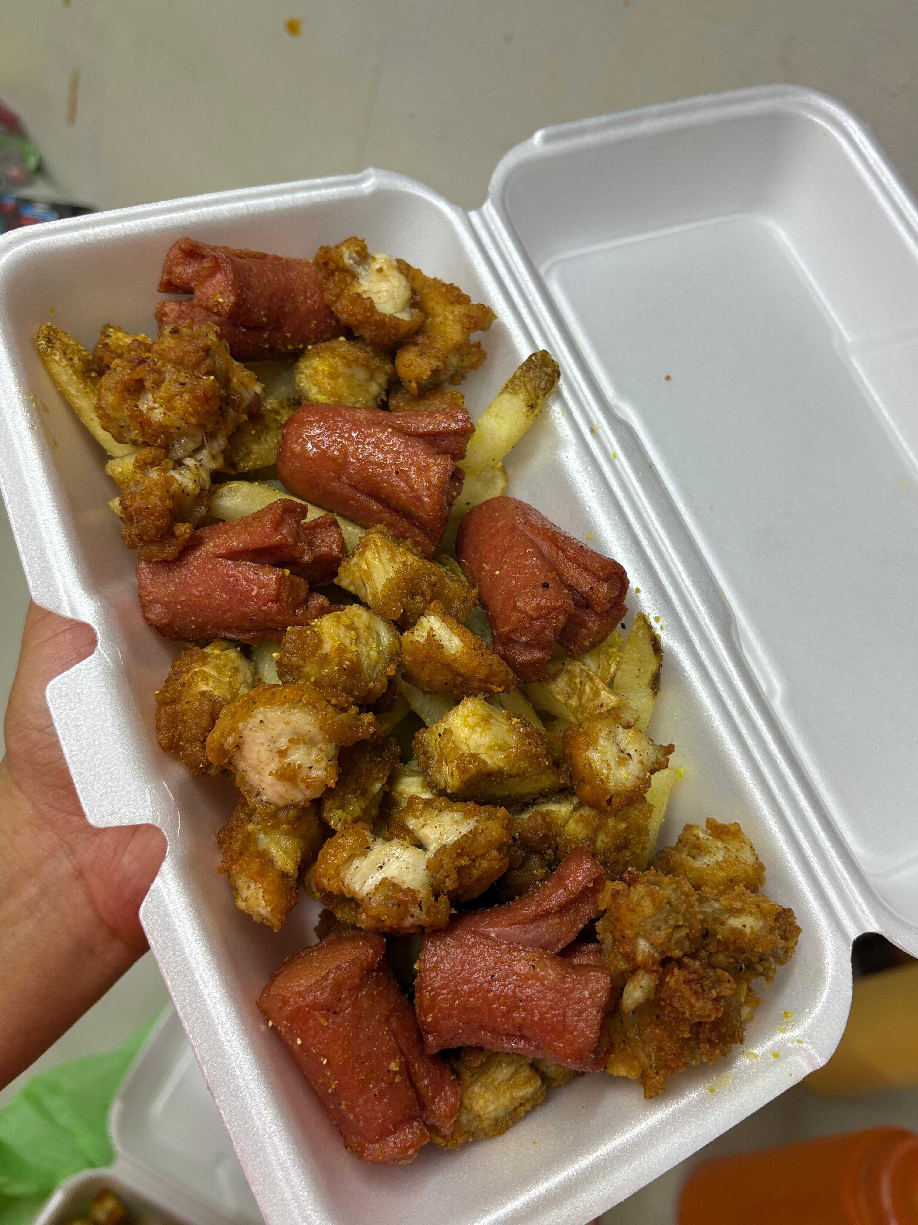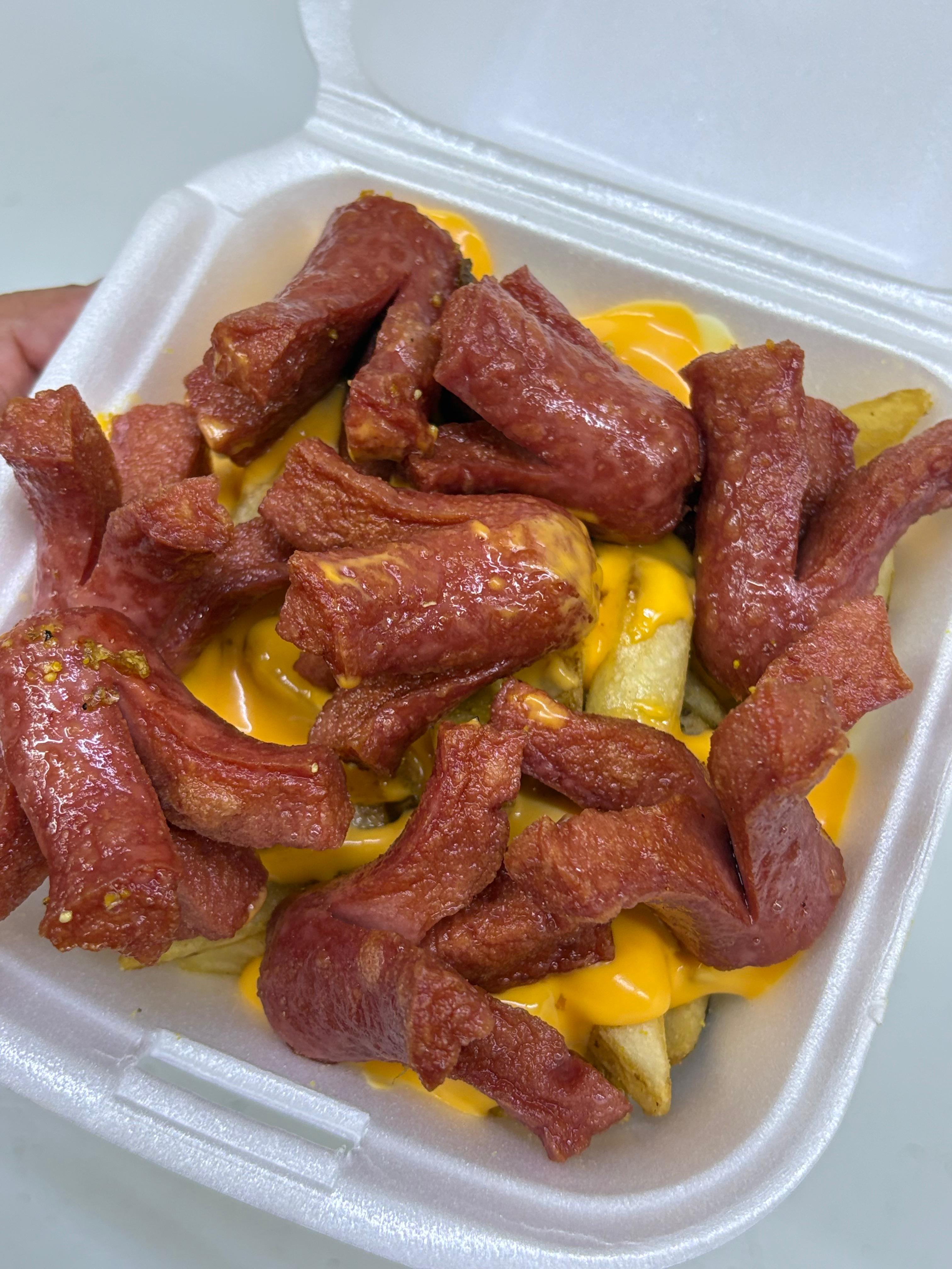 Cama de papas fritas rociadas en pimienta limón y cubiertas con trocitos de salchicha de pavo, aderezos más salsas de elección.