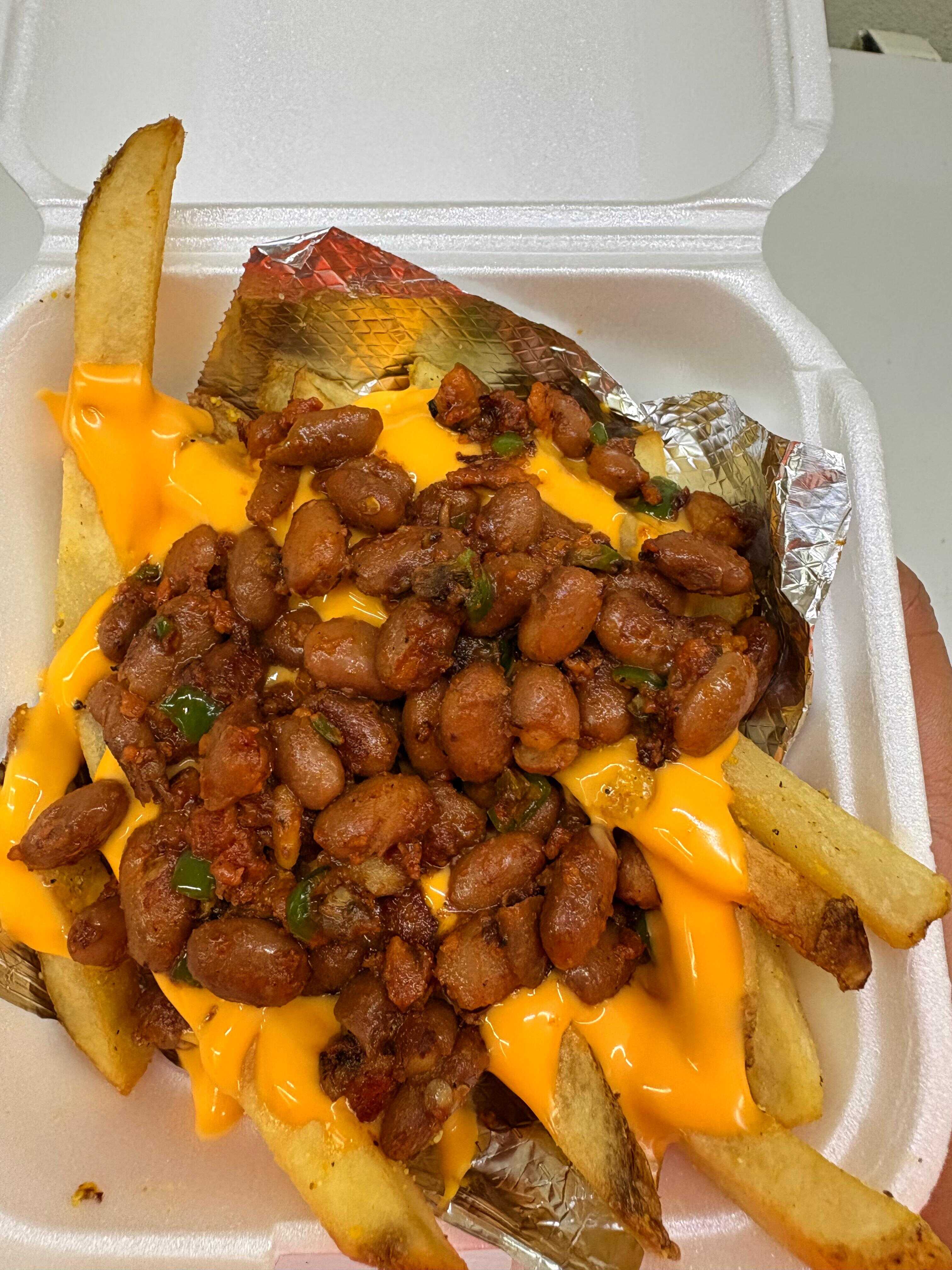 Cama de papas a la francesa bañadas en queso cheddar, cubiertas de frijoles ranch guisados en chorizo y trocitos de serrano con un toque decorativo de ajonjolí y salsa de tu elección.