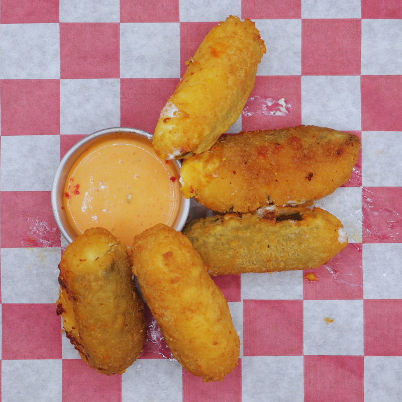 5 Jalapeños con queso crema empanizados con un aderezo ranch para chopear.