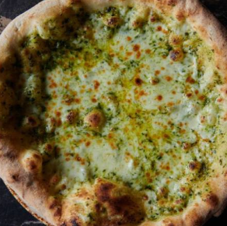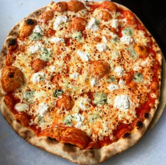 Exquisita pizza al horno, base de queso mozzarella, cubierta con queso parmesano, gorgonzola y gouda.