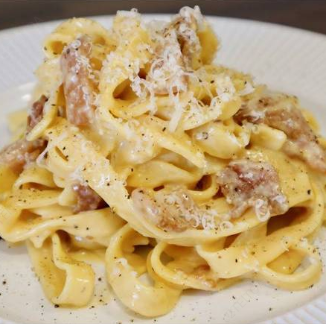 Fetuccini en nuestra tradicional salsa a la carbonara, acompañada de tocino, queso parmesano y un toque de albaca.