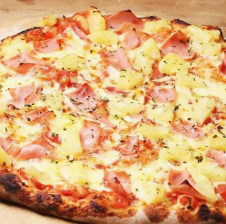 Exquisita pizza al horno, deliciosa base de queso mozzarella, jamón de pavo y trozos de piña.