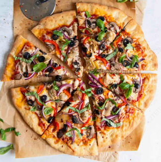 Exquisita pizza al horno, queso, pimiento verde, acelga, tomate cherry, salsa pesto, champiñones y corazón de alcachofa.