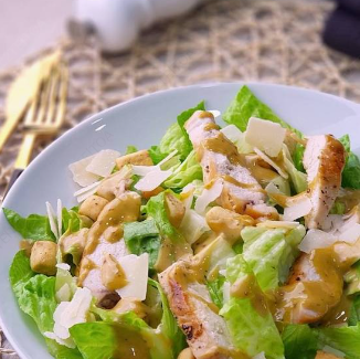 Mix de lechugas, tomate cherry, espinaca, zanahoria, croutones, pollo, acompañada de aderezo cesar.
