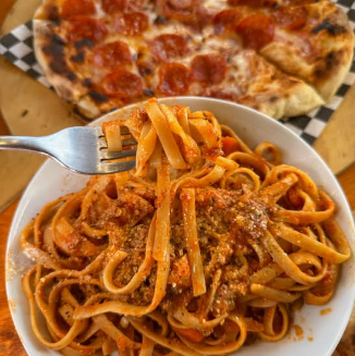 Exquisito fetuccini en salsa de tomate, acompañado de carne molida, queso parmesano y un toque de albahaca. Acompañada con pan de la casa.