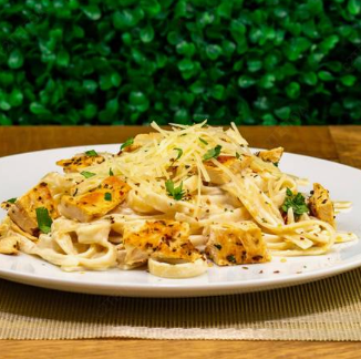Exquisito fettuccini en salsa Alfredo acompañada de queso parmesano, pollo, albahaca y pan de la casa.