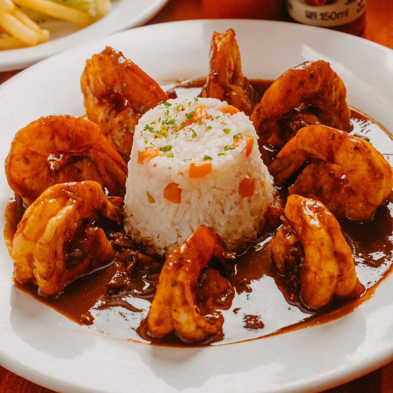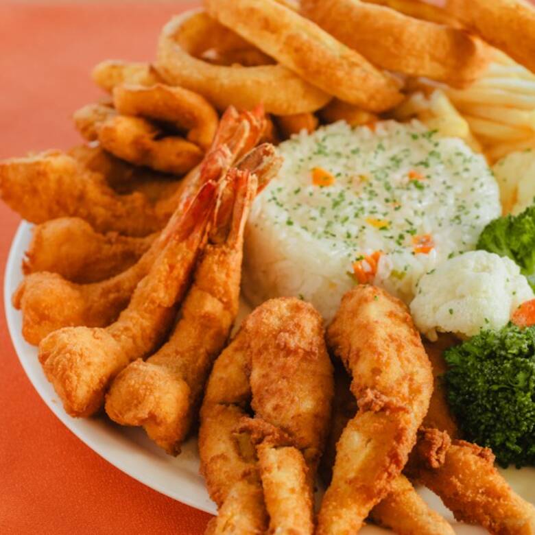 Camarón tamaño especial, filete de pescado y ancas de rana (o cambio de ancas por más camarón y pescado) con guarnición tradicional: arroz, verduras, papas a fritas y aro de cebolla. Acompañado de salsa tartara, limón y salsa picante.