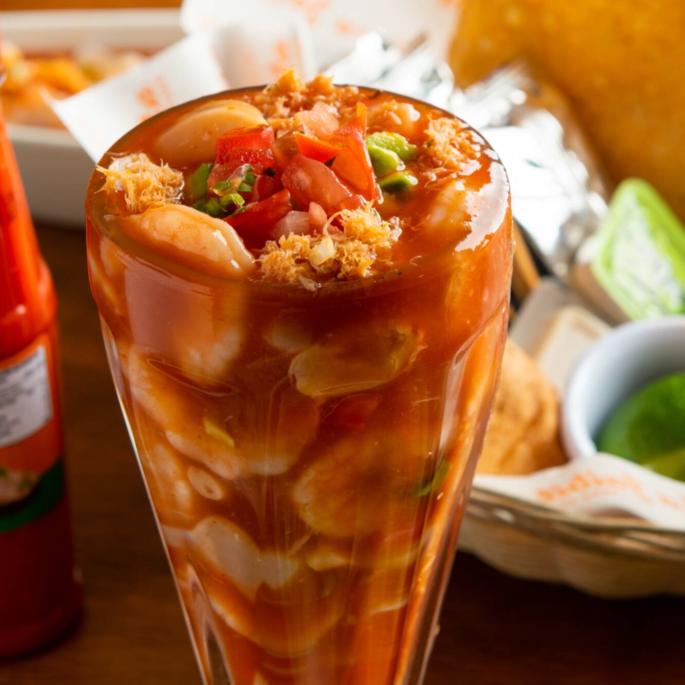 220 ml. Camarón en fresca salsa coctelera con pico de gallo y aguacate. Acompañado de galletas y salsa picante.